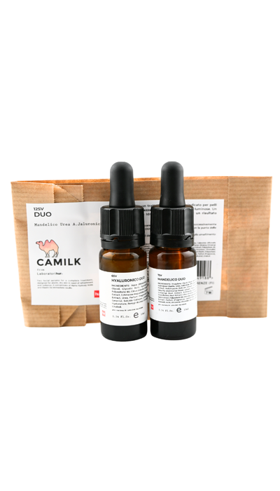 MANDELICO DUO:Propylene Glycol, Aqua (Water/eau), Hydrolyzed Elastin, Urea, Calendula Officinalis Flower Extract, Helichrysum Italicum Extract, Chamomilla Recutita (Matricaria) Flower Extract, Panax Ginseng (Ginseng) Root Extract, Echinacea Angustifolia (Coneflower) Root Extract, Citrus Grandis (Grapefruit) Seed Extract, Polysorbate 60, Sterculia Scaphigera Seed Extract, Parfum (Fragrance), Camel Milk, Geraniol, Mandelic Acid, Limonene, Citronellol, Alcohol, Linalool. HYALURONICO DUO: Aqua (Water/eau), Propylene Glycol, Glycolic Acid, Hydrolyzed Elastin, Polysorbate 60, Citrus Grandis (Grapefruit) Seed Extract, Echinacea Angustifolia (Coneflower) Root Extract, Urea, Parfum (Fragrance), Camel Milk, Geraniol, Soluble Collagen, Limonene, Sodium Hyaluronate, Benzyl Alcohol, Citronellol, Alcohol, Linalool.