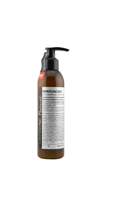 Crema a base di Peperoncino e Centella dalle note proprietà drenanti, ideale nei trattamenti per il ristagno di liquidi e depositi di grasso, riscalda senza ungere e rende la pelle compatta e soda.